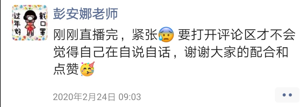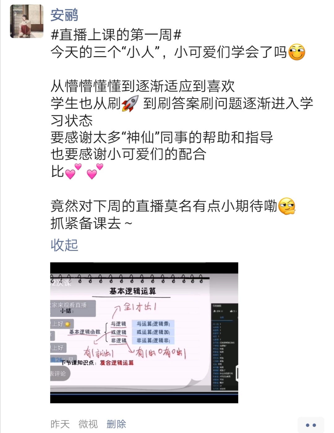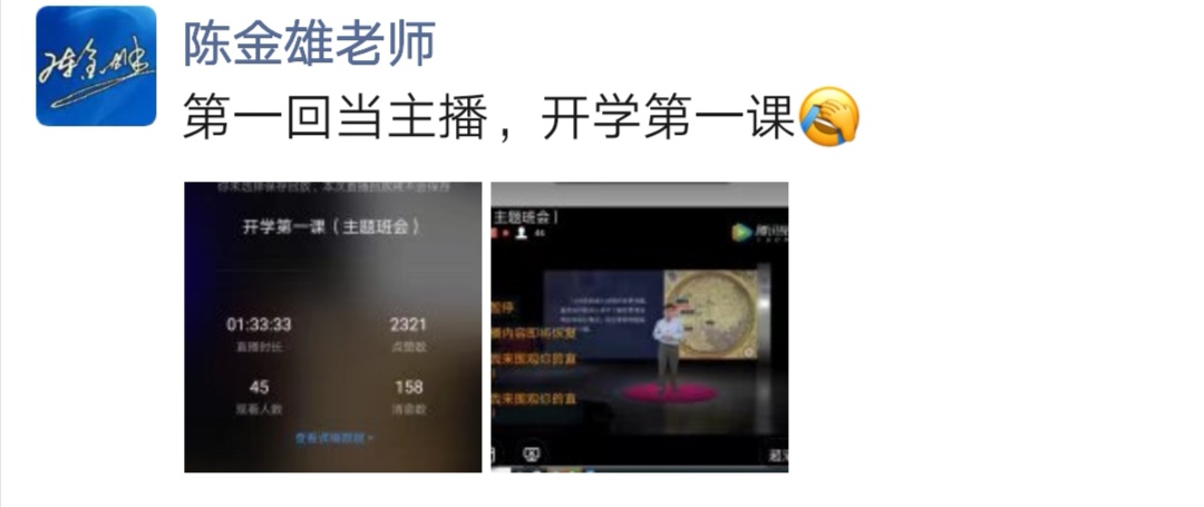 一周网课结束,陈丽雅老师感叹道:就是觉得十八线主播不容易,不过还是学到挺多东西的。信息化时代的教学确实值得我们更多的思考。课程组开了几次视频会议,互相调试直播,第一次把教学研讨搬到了线上。很多教学上的大胆尝试,我觉得挺有意思的。也很佩服老师们的奇思妙想,我对这种教学模式的转换还是充满期待的。