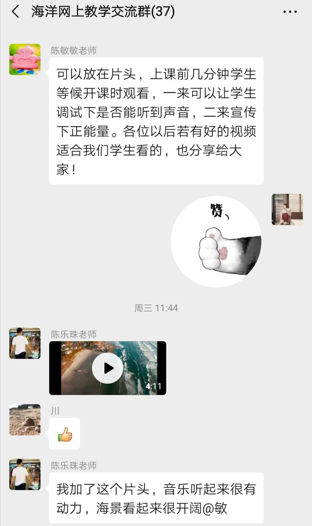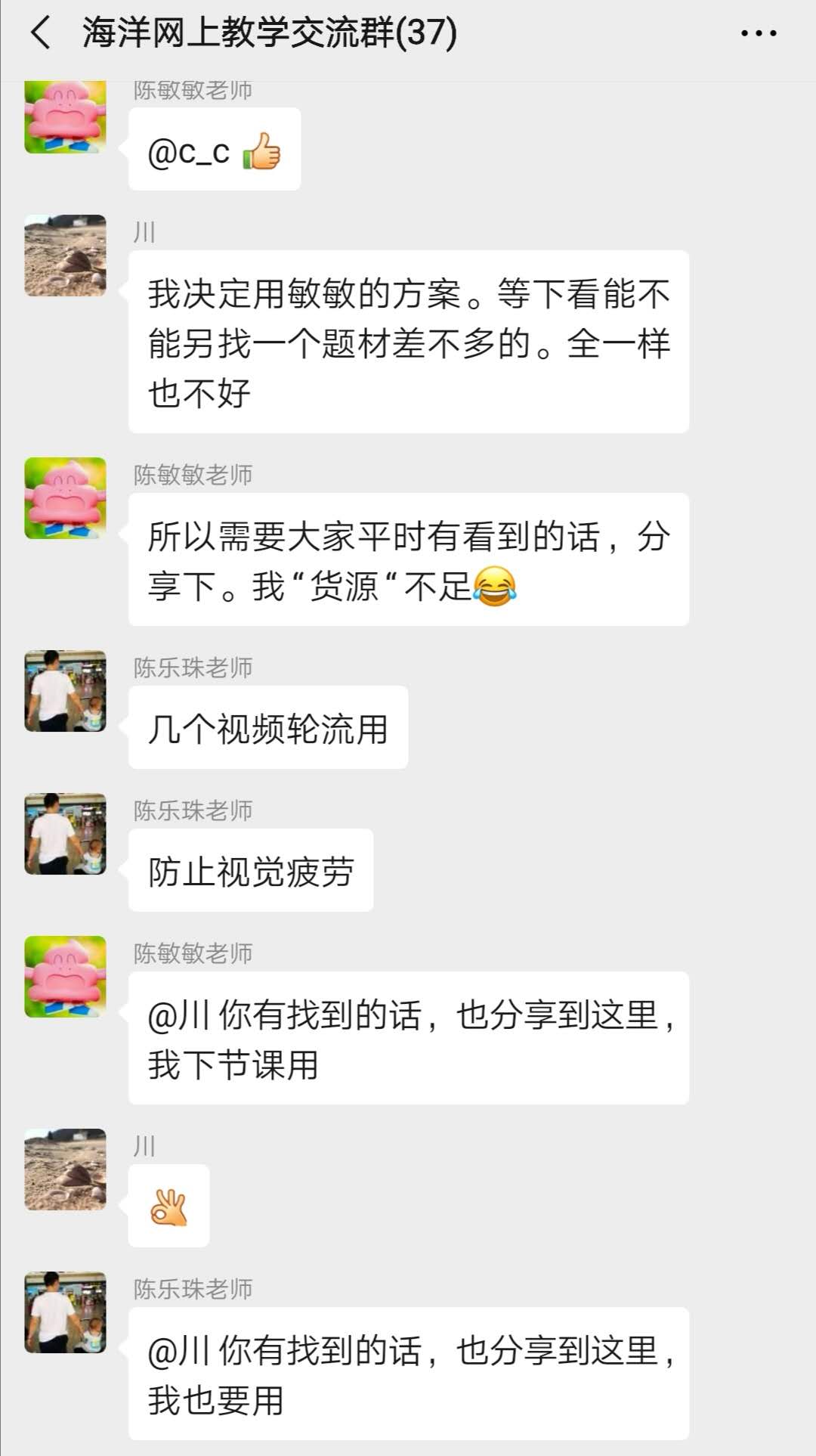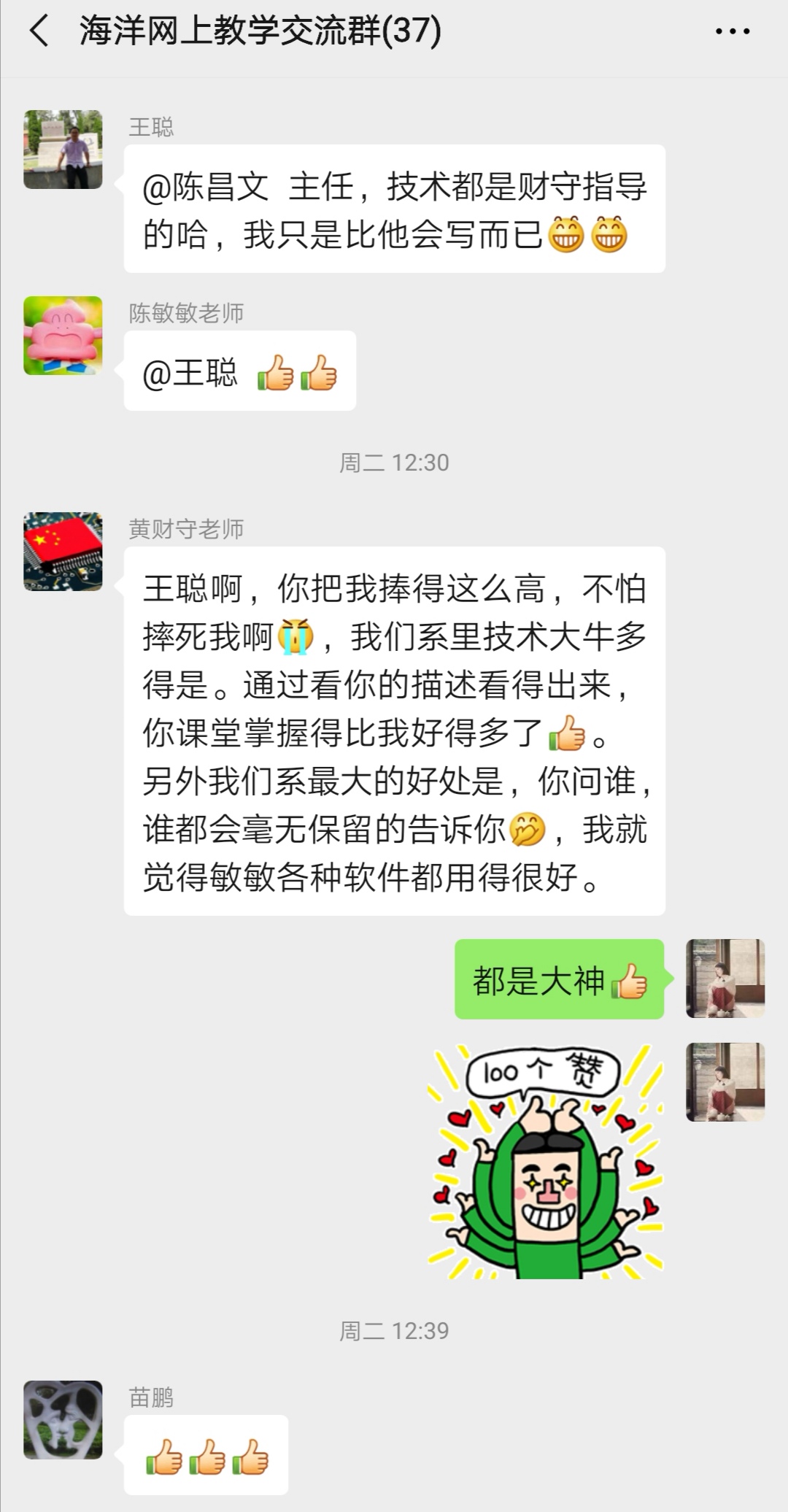 在海洋系网上教学交流群里,教学信息、经验、心得的分享从来都是豪无保留;在海洋系各课组群里,PPT共享、课程资料资源共享;海洋系的网课课程都是以课组为单位组建的。在网课的准备过程中,大家无心计较谁做多谁做少,无心计较得失,只一片赤诚期望为员工上好课,齐心协力坚守好专属于教师的教育阵地。