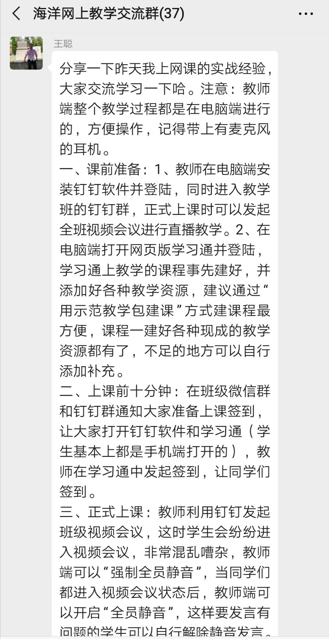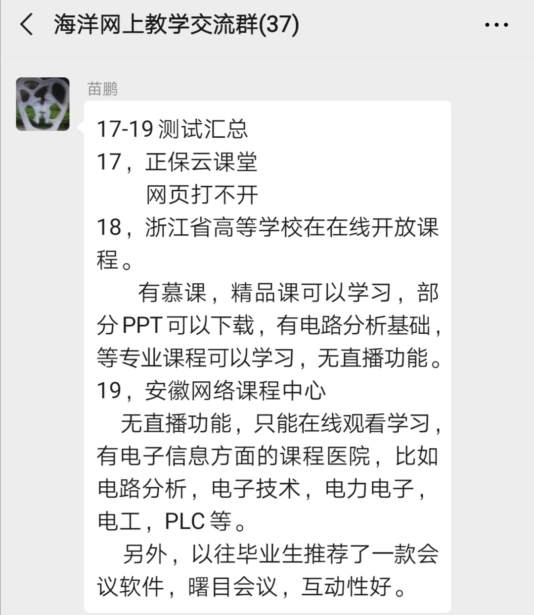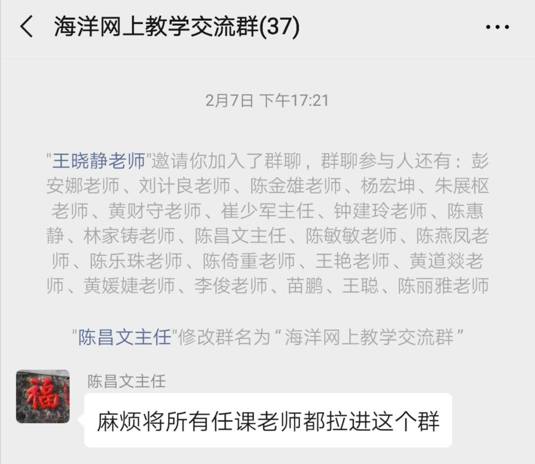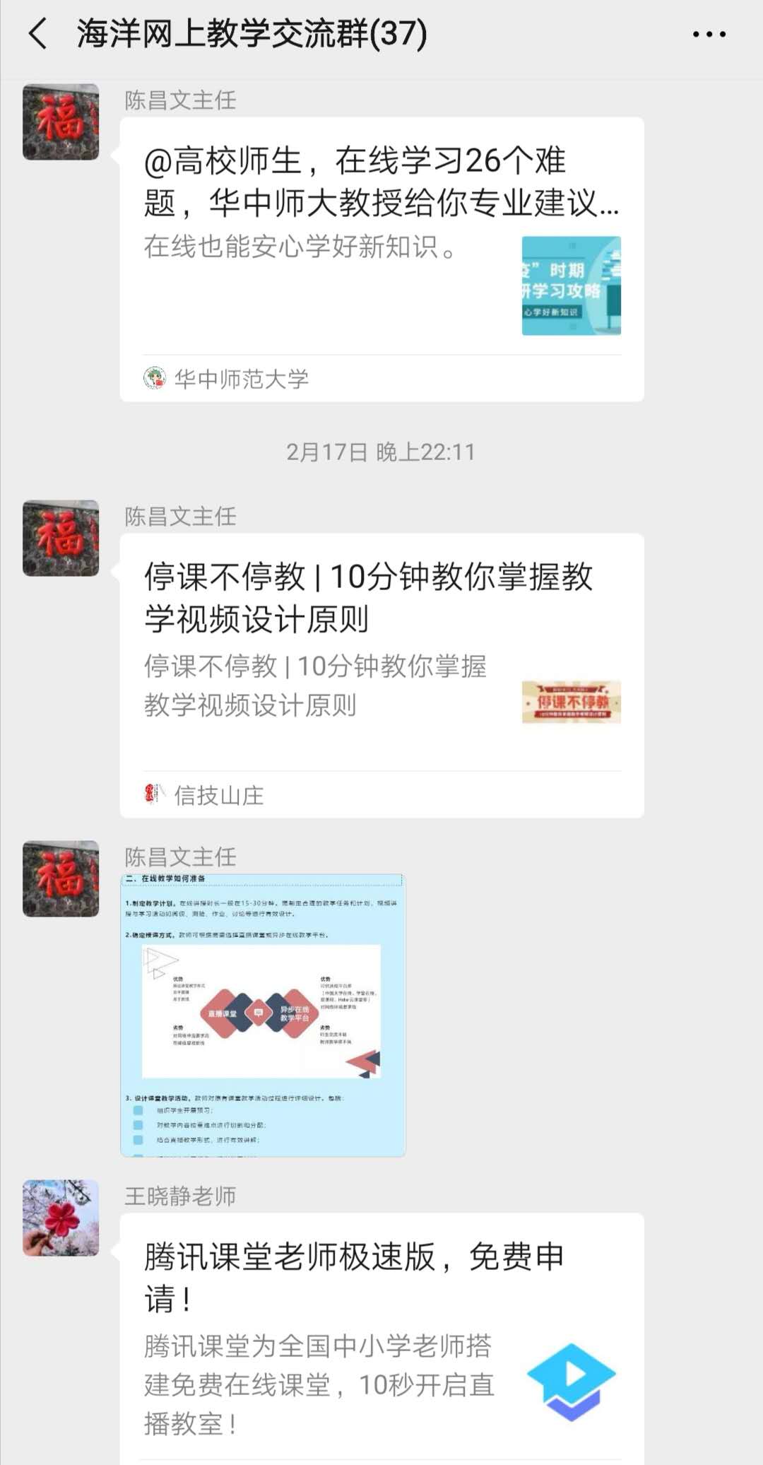 2月7日,海洋系在系部线上会议结束后当即成立了海洋网上教学交流群。自交流群成立起,一方有问题,八方来回应;一方有心得,即分享告知八方。全系教师拧成一股绳,齐心守好教育阵地。