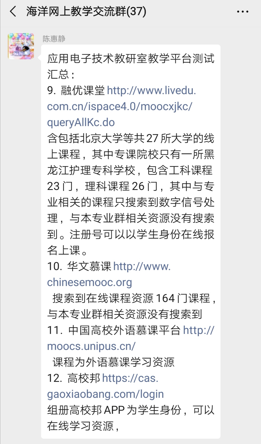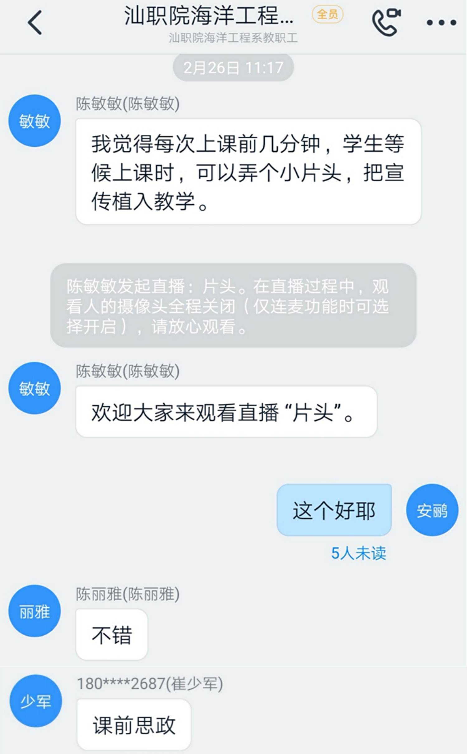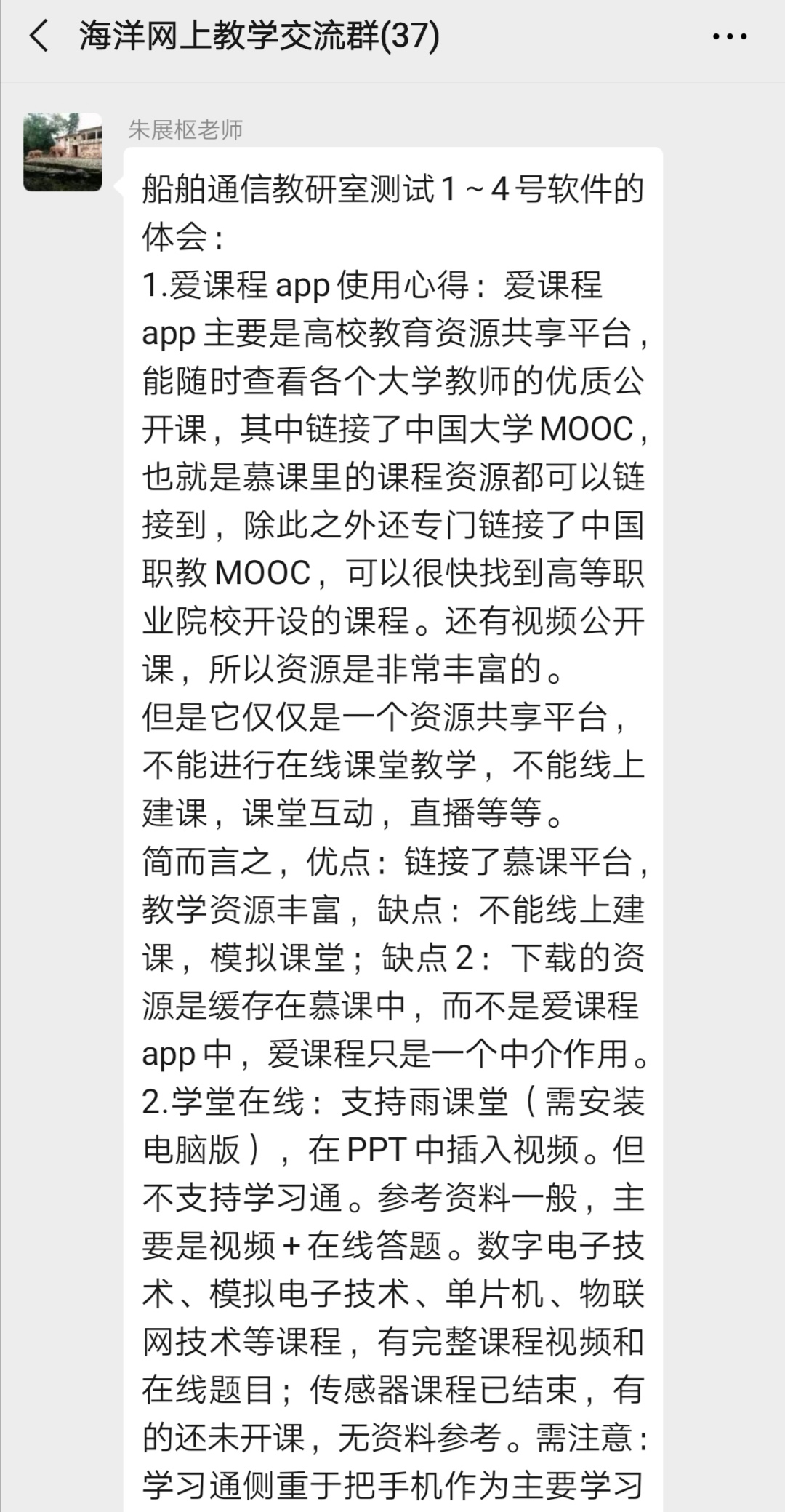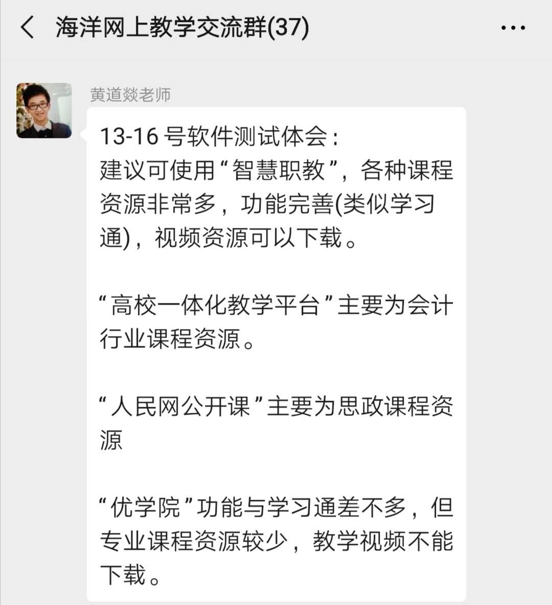 2月7日,海洋系在系部线上会议结束后当即成立了海洋网上教学交流群。自交流群成立起,一方有问题,八方来回应;一方有心得,即分享告知八方。全系教师拧成一股绳,齐心守好教育阵地。