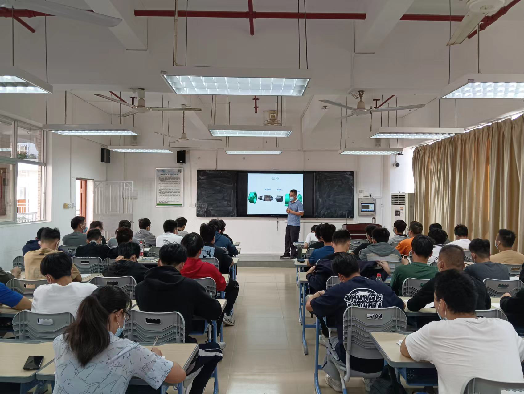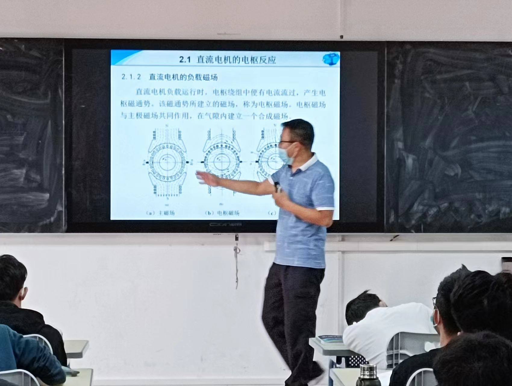 接下来,王青林老师细致地讲解了直流电机的磁场、电枢反应、感应电动势、电磁转矩等主要内容,师生互动良好,课堂氛围活跃,能够发挥员工主体性,主动性,在发现规律,研究规律、理解未知事物中将马克思主义唯物论融入理论知识的传授中。