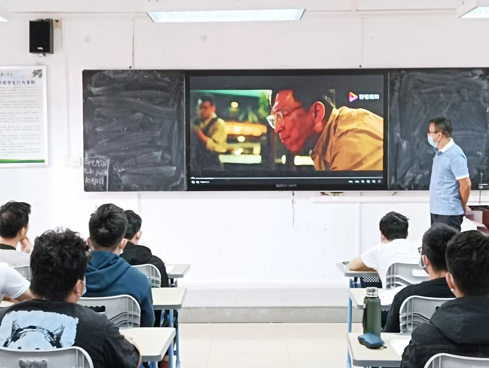 视频播放完毕后,王青林老师告诉同学们,影片主角的原型就是五星红旗电动旗杆的设计者、潮汕地区的骄傲——林治远总工程师。是他顶着巨大的压力,确保了开国大典的顺利进行。他深情地希望同学们能够努力学习,不断进取,继承和发扬老一辈机电人的细致、专注、敬业、创新精神,争当大国工匠。