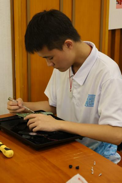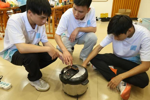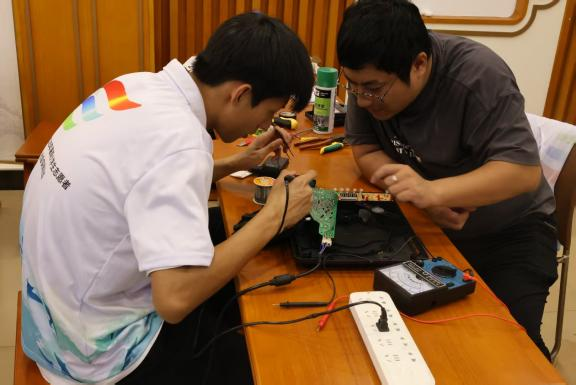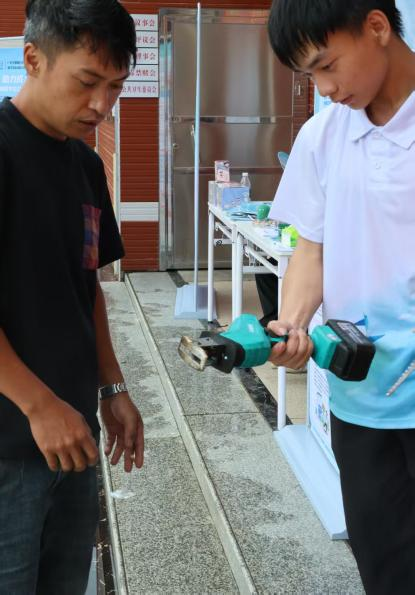 活动当天下着倾盆大雨,但志愿团成员们风雨无阻,早早抵达金町村公埔文化广场。一到现场,他们迅速分工,开始搭建临时维修服务站。搭建完成后,志愿者们携带好专业工具和备用零件,随即便投入到为村民提供家电免费检修服务的工作中。从电饭煲、电磁炉、电风扇到手电钻,志愿者们对每一件家电都进行了细致的故障排查,更换损坏元件,并耐心地向村民讲解日常使用的注意事项。考虑到部分村民行动不便,团队还专门组织了小分队,上门为老人提供维修服务,以确保维修服务能够覆盖到更广泛的群体。与此同时,志愿者还向村民普及家庭用电常识,重点讲解电线老化识别、漏电保护装置使用、暴雨天气防触电等实用知识,并针对常见的私拉乱接电线、超负荷用电等安全隐患提出改进建议。