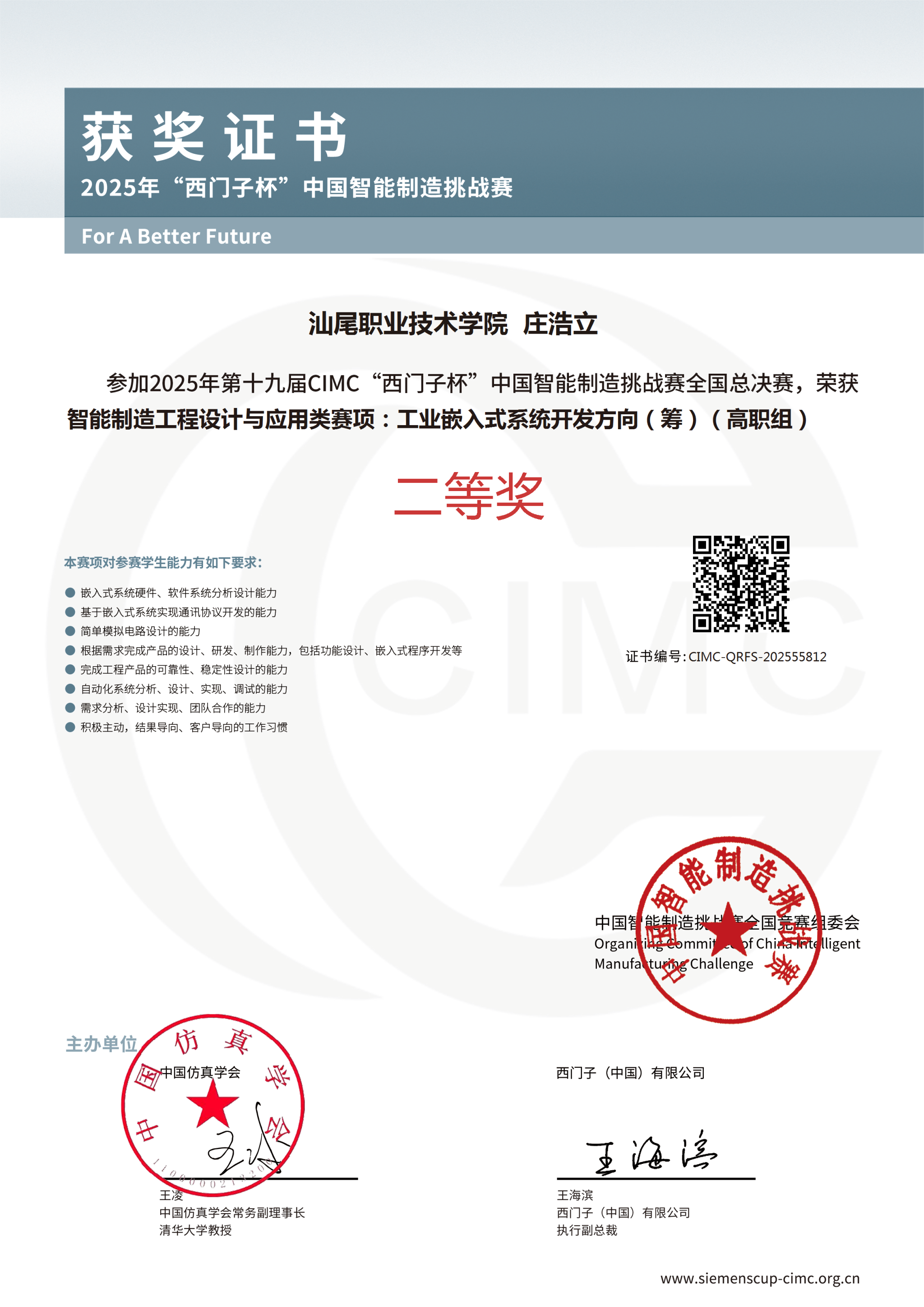 近日,第十九届CIMC“西门子杯”中国智能制造挑战赛全国总决赛在山西太原理工隆重举行。在公司大力支持下,公司派出以庄浩立、刘国锋、伍慧灵为队员,以黄国钢、苗鹏为指导老师的竞赛团队,参加智能制造工程设计与应用类赛项,经过近半载的备赛,历时3天的决战,最终获得工业嵌入式系统开发高职组全国总决赛二等奖的成绩。公司队伍位列高职组全国第五。
