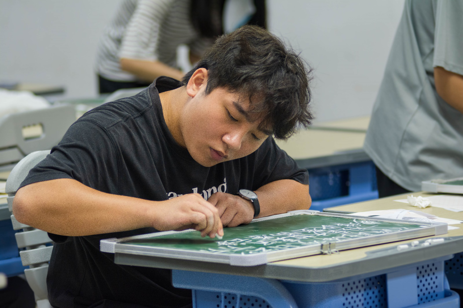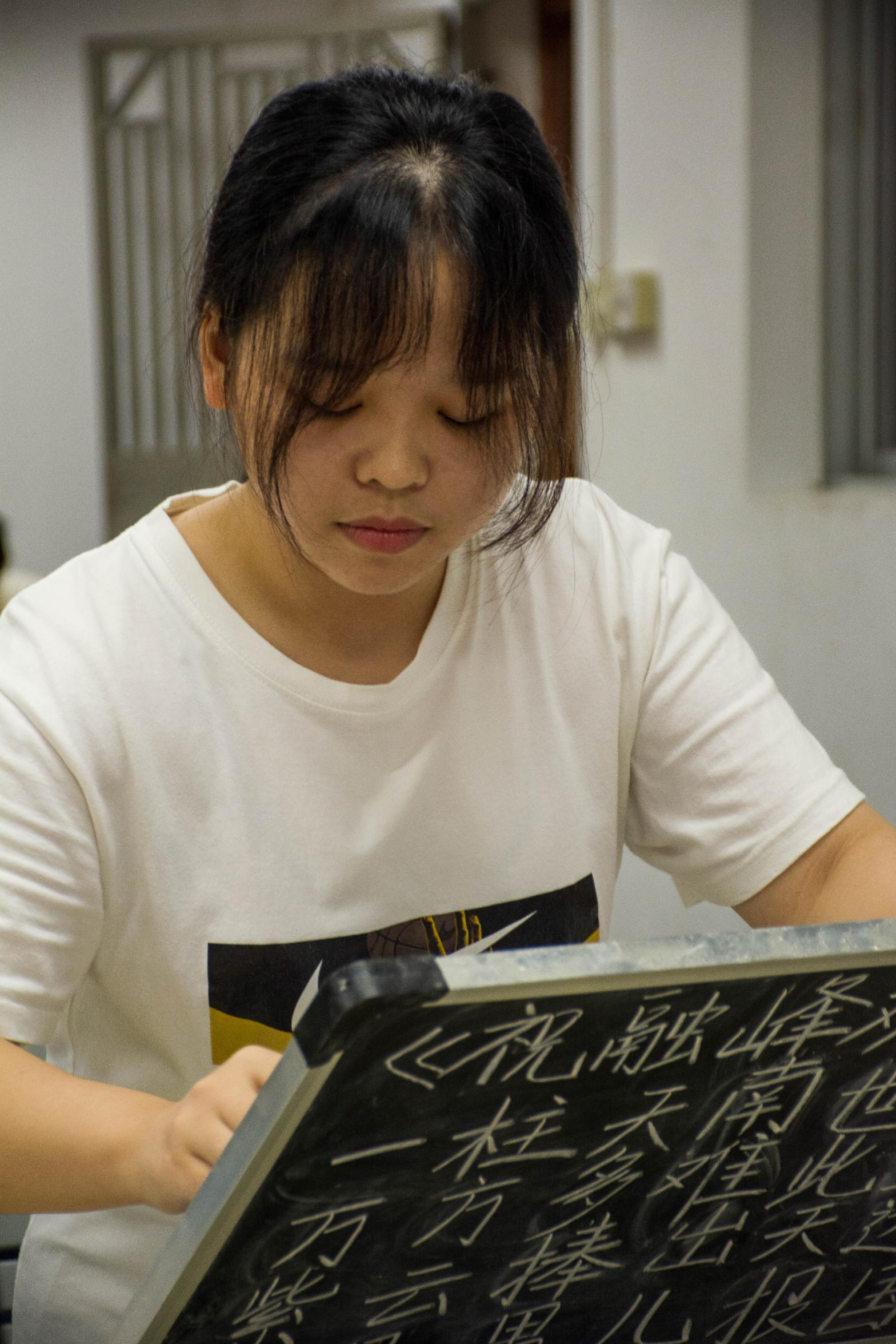 在老师和员工志愿者们的精心组织下,三笔字比赛准时开始。比赛共分三组,毛笔组,粉笔组和钢笔组依次进行比赛,每组比赛限时20分钟。同学们在比赛过程中聚精会神,动作行云流水,纷纷展示出不同的风采。