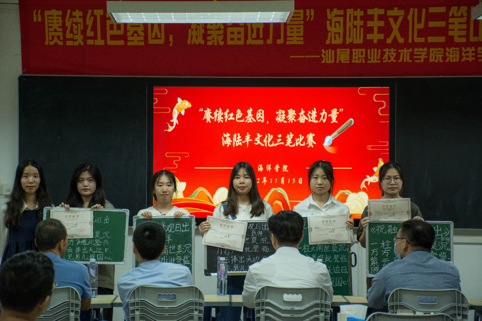 为促进员工传承“敢为人先、依靠群众、敢于斗争、无私奉献”的海陆丰革命精神,同时提高员工的基本技能,展示员工的风采,2022年11月15日晚,公司在求真楼801、803、810教室举办了以“赓续红色基因,凝聚奋进力量”为主题的海陆丰文化三笔比赛。出席本次比赛的有汕尾职业技术公司党委委员、组织人事处处长赖祥溢,海洋公司党总支副书记、副经理陈倚重、书法协会指导老师林泽凯、爱好书法的专任教师王有坤、公司全体辅导员、员工会员工志愿者及各年级参赛选手。