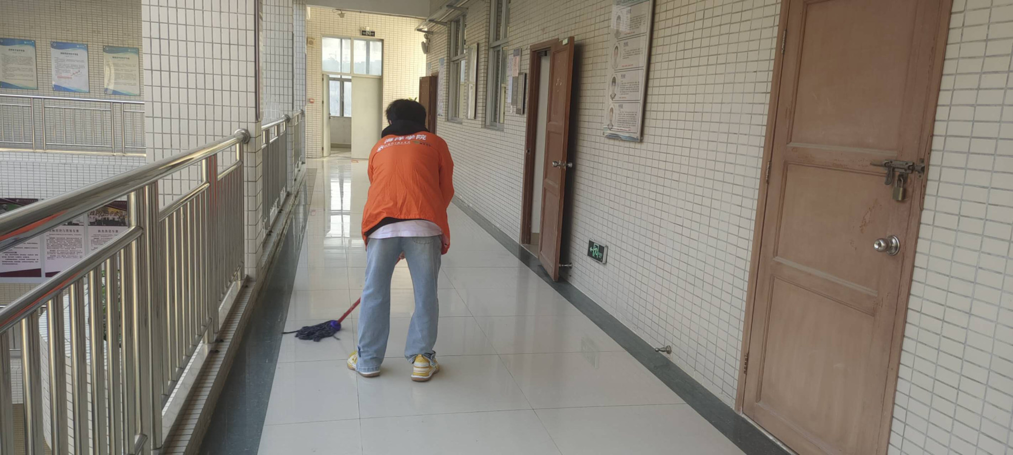 早上八时,志愿者们着橙色志愿者服在求真楼八楼集合。分工合作,对各教室进行了全面认真地清理打扫。同学们齐心协力清理卫生死角,不放过任何一处小细节。