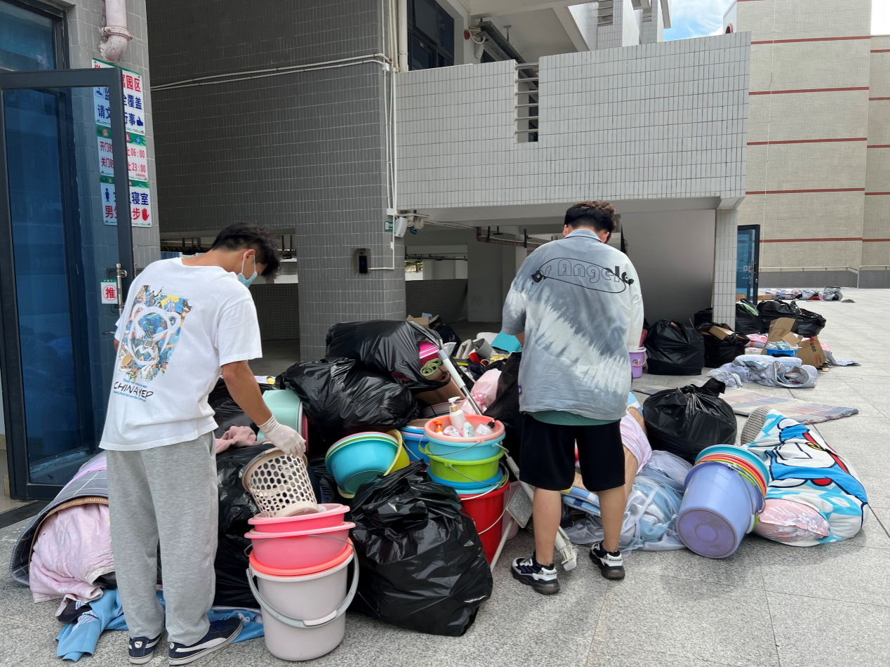 公司负责员工社区的辅导员和员工会宿管组成员于当天10:00对毕业班宿舍进行了现场的卫生检查,之后按照宿舍卫生情况提前部署和分配志愿者卫生清理工作。宿舍物品比较杂多、宿舍卫生比较差的宿舍分配2-3人,宿舍物品比较少、卫生情况良好的宿舍则分配1人。每栋楼还分别安排了3-5名机动组人员,专门负责给需要帮忙的宿舍提供帮助(比如扛重物下楼)和验收宿舍。