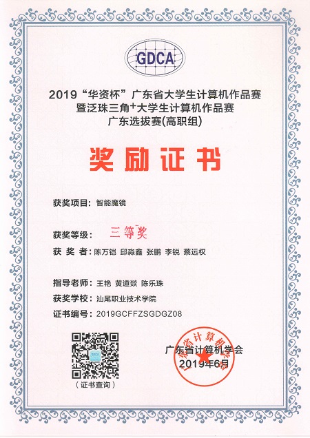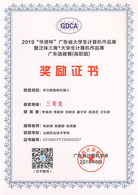我系选送作品《多功能智能机器人》(员工:李焕洲,李啟荣,刘树洪,谢子珍,连泽武,王钊源;指导老师:林家铸,陈惠静,陈倚重)、《智能魔镜》(员工:陈万铠,邱淼鑫,张鹏,李锐,蔡远权;指导老师:王艳,黄道燚,陈乐珠)获得高职组两项三等奖。
